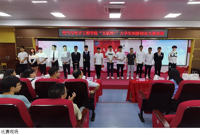 本网讯(电气与电子工程学院)4月23日,电气与电子工程学院2021年“互联网+”大学生创新创业大赛决赛在42栋101成功举行,电气与电子工程学院院长关健、党总支书记陈文华、副院长陈新欣、副书记陈强、牟长森教授、黄美莲副教授出席活动并担任大赛评委,全体辅导员、项目指导教师、各学生组织代表、各班级学生代表共同观看了比赛。