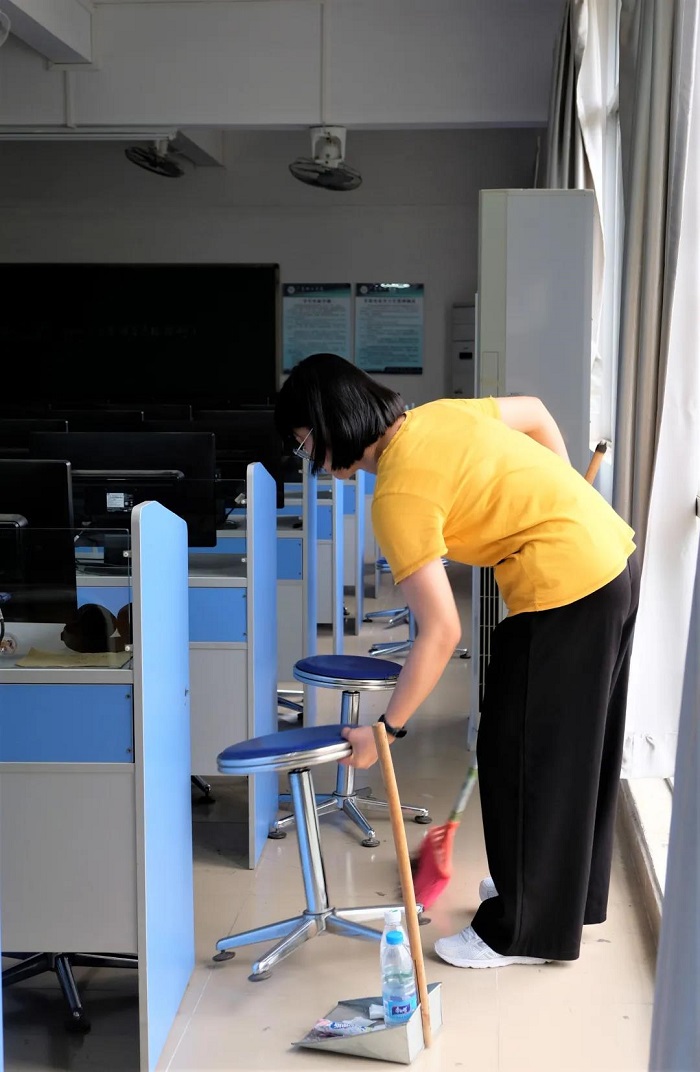 在学院党总支书记、学院领导的统筹组织下,黄老师与外国语学院实训室负责人赵家驹老师沟通协调,将督查小组及学生建党对象分成四个小组。各小组在党员教师的带领下前往对应实验室进行卫生清洁。同时,赵老师对每个实验室进行检查,确保清洁工作落实到位。实验室在党员老师和督查小组等同学的努力下焕然一新。