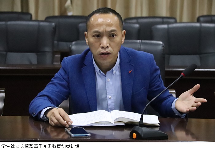 随后,谭蒙革处长从认识开展党史学习教育的重大意义、掌握党史学习教育的学习重点以及落实党史学习安排三个层面对这次党史学习教育做了全面动员。他指出党史学习教育:一是深化思想,深刻领会党史学习教育的重大意义。充分认识开展党史学习教育是贯彻党的教育方针、落实立德树人根本任务的必然要求。二是突出党史学习教育重点,准确把握党史学习教育的核心要义。把“学史明理、学史增信、学史崇德、学史力行”贯穿于党史学习全过程,切实做到学党史、悟思想、办实事、开新局。三是严格落实党史学习教育学习安排,定期、高质量地开展党史专题活动。