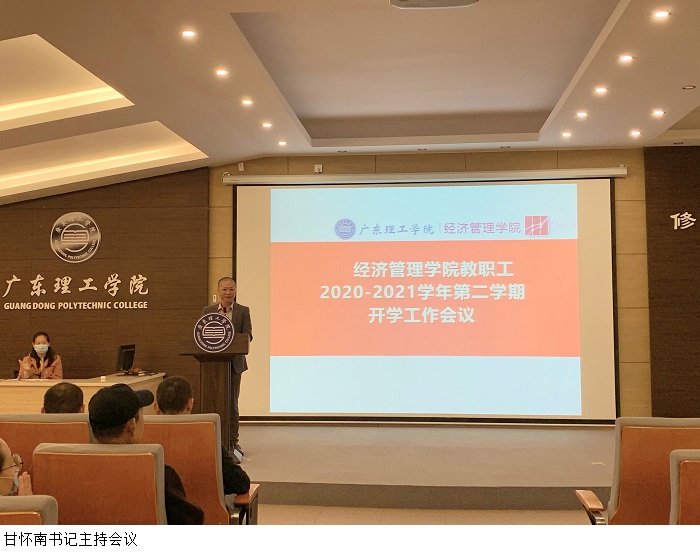 本网讯(经济管理学院)3月1日上午,经济管理学院教职工2020-2021学年第二学期开学工作会议在伟德官网鼎湖校区行政楼三楼学术报告厅召开。本次会议由党总支甘怀南书记主持,季六祥院长、魏嫚副院长、陈东旭副院长、党总支吴楚升副书记、办公室李佳妍主任出席会议,我院全体教职工参会。