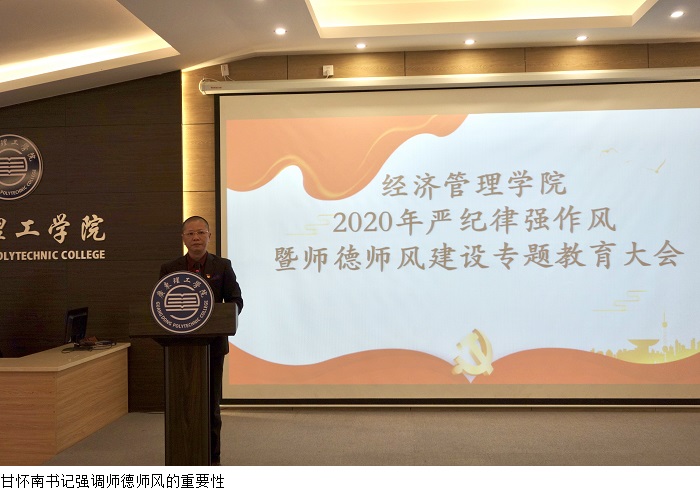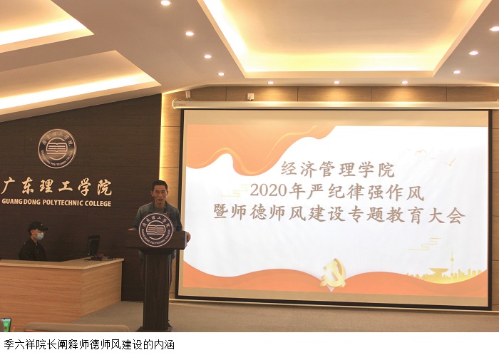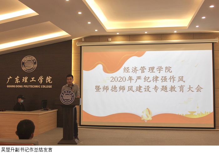 本网讯(经济管理学院)根据《伟德bv国际体育党委关于加强伟德官网党的政治建设贯彻落实< 民办高校党建工作重点任务>的决定》(广东理工党【2020】11号)的文件精神,为进一步强化党纪教育和师德师风建设,12月29日下午,我院于行政楼学术报告厅召开“2020年严纪律强作风暨师德师风建设专题教育”大会。季六祥院长、党总支甘怀南书记、魏嫚副院长、陈东旭副院长、办公室李佳妍主任出席大会,经管学院全体教职工参会,党总支吴楚升副书记主持。