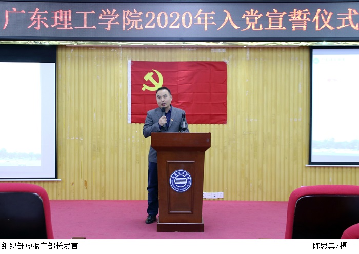 大会在《国际歌》歌声响起下正式开始。歌声响毕,进行大会宣誓议程,廖部长上台领誓,预备党员同志全体起立,面向党旗,高举右手,面容肃穆,庄严地进行宣誓。随后,廖振宇部长代表学校党委向全体新发展党员提出了明确的要求:一是树立形象,认清自己的位置,在任何时候都要记住自己的党员形象;二是牢记宗旨,发挥模范带头作用;三是加强努力学习,不断提高个人修养,加强党的理论学习;四是积极参加党的活动,按时交纳党费。希望同志们不要辜负学校党委的期望,自觉增强党性意识,以实际行动践行自己的入党誓词,发扬党的优良传统,牢记全心全意为人民服务的宗旨,在各自的岗位上倍加努力的学习与工作,充分发挥党员的先锋模范作用,无愧于共产党员的光荣称号。