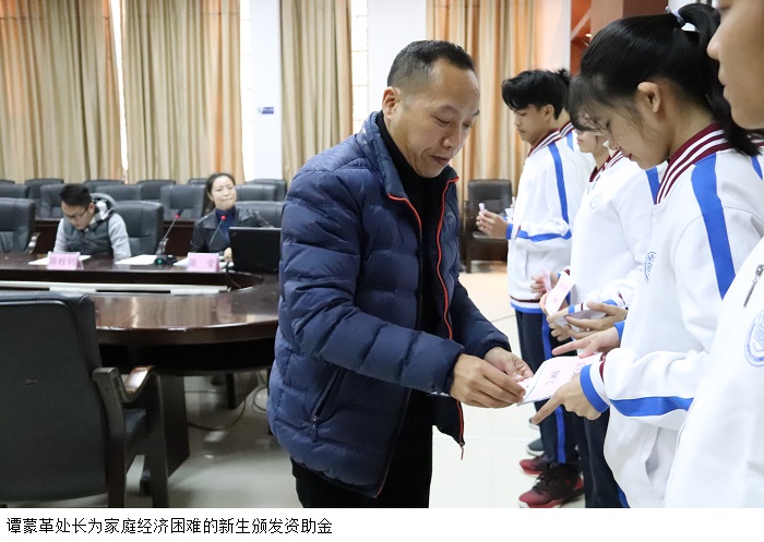 本网讯(学生处)为了激励广大学生刻苦学习,鼓励更多的优秀高中毕业生报考伟德官网和帮助家庭经济困难学生的困难,12月8日下午,学生处在高要校区行政楼101会议室举行2020级优秀高分新生奖学金及家庭经济困难新生资助金发放仪式。学生处谭蒙革处长、各院系学工部部长、辅导员代表及优秀高分新生奖学金获得者、家庭经济困难新生代表出席本次发放仪式。会议由学生处奖助贷科陈莹老师主持。
