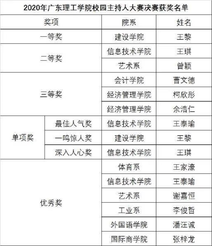 本次大赛由自学考试办公室黄声巍主任、学生处彭雪帆副处长、外国语学院王泽熙副院长、团委林博伟老师和高要广播电视台专业主持人何颖老师担任评委。团委张冬书记、汽车工程系党总支钟兆天书记、团委何海辉副书记以及各院系领导及老师出席了本次大赛。