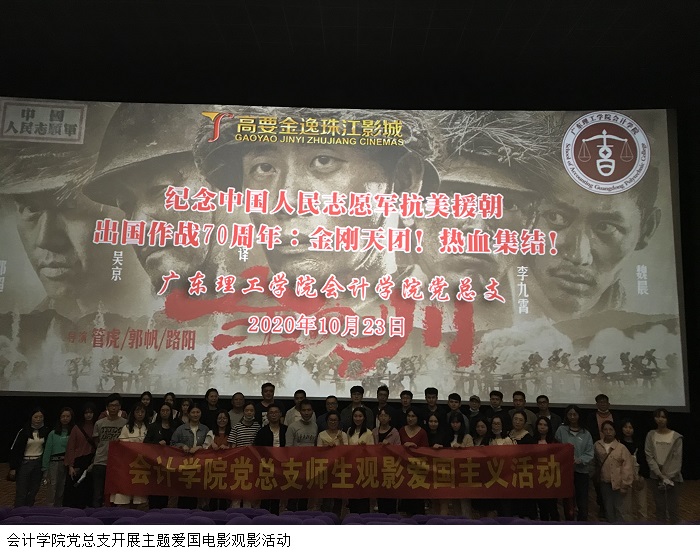 本网讯(会计学院新闻中心 何嘉敏)为了纪念中国人民志愿军抗美援朝出国作战70周年,告慰197653位抗美援朝烈士。10月23日,会计学院党总支在高要金逸珠江影城开展以“金刚天团!热血集结!”主题的爱国电影观影活动,参加本次活动的有党总支黎伯毅书记、党员教师们以及会计系学生。
