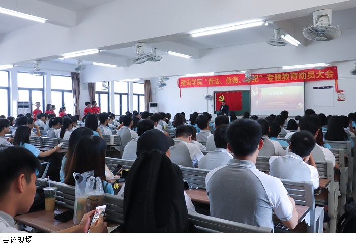 本网讯(建设学院学生党支部)为落实党的十九大精神,坚持“依法治校、以德治校”。 10月27日,建设学院学生党支部于6206教室召开“普法、修德、守纪、创优良学风”演讲比赛动员大会,建设学院党总支周景报书记、焦根平副书记、学生党支部张毓恒书记、吴良超老师、全体辅导员、学生党支部全体成员及各班代表。