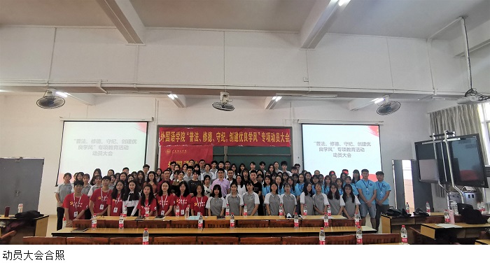 本网讯(外国语学院)为认真学习贯彻党的十九大精神,积极响应以习近平同志为核心的党中央对顺应法治时代的要求,坚持和落实“依法治校,以德治校”的理念。10月27日下午, 外国语学院举行“普法、修德、守纪,创建优良学风”专项教育活动动员大会。参加本次大会的领导有外国语学院党总支李永青书记、吕媛副书记、全体辅导员老师及学院学生党支部先锋队各部门干部与干事。