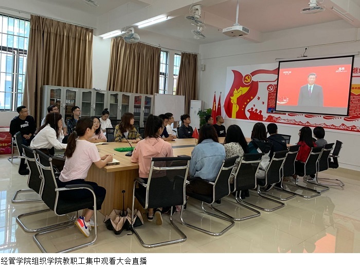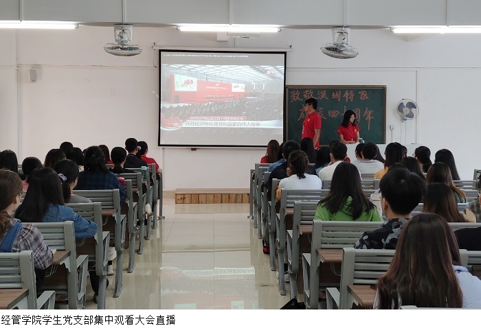 本网讯(经济管理学院)10月14日上午,深圳市隆重举行深圳经济特区建立40周年庆祝大会,中共中央总书记、国家主席、中央军委主席习近平出席大会并发表重要讲话。经济管理学院党总支副书记吴楚升组织学院教职工于4栋103观看大会直播,经管学院学生党支部工作助理以及学生党员于7栋207观看大会直播。