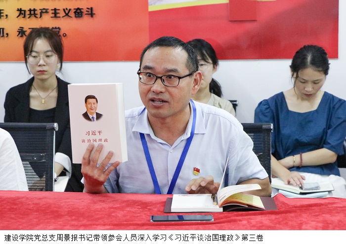 周景报书记作总结发言。周书记表示,身为党员教师,前期要学好悟透著作里的精神,后期更要具体细化著作内容,从中提取与教学性质密切的内容更加深入地去探索学习。