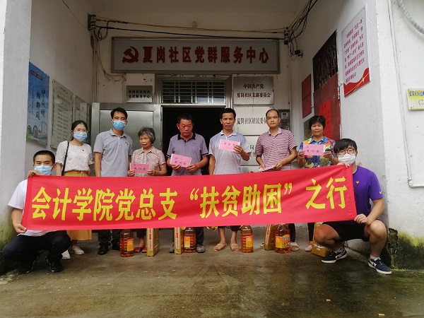 本网讯(会计学院 新闻中心)为深入学习贯彻习近平新时代中国特色社会主义思想和党的十九大精神,强化党的思想引领,积极响应政府号召将扶贫工作落到实处。6月18日,在会计学院党总支书记黎伯毅的带领下,会计学院学生党支部书记郭凤玮与新闻中心指导老师苏旭、辅导员詹庆文、常继军老师等人去到夏岗村开展扶贫行动。