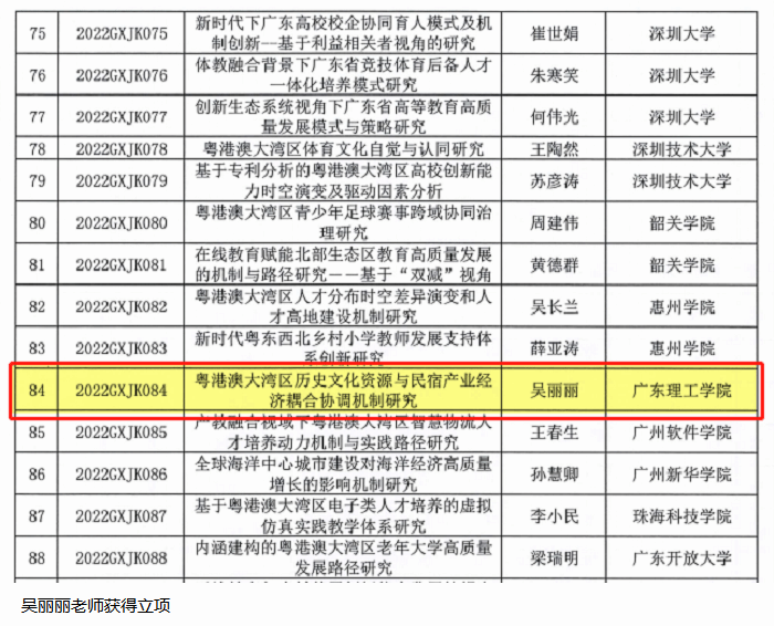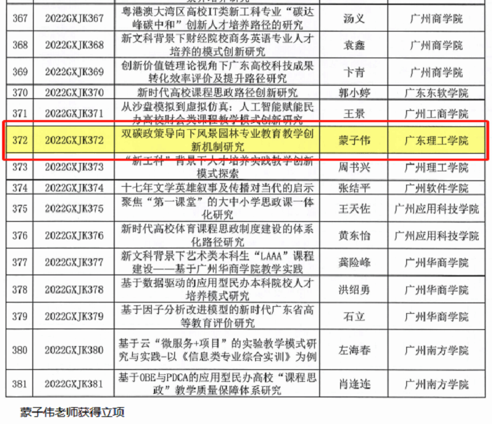 本网讯(科技处 刘霞)近日,广东省教育科学规划领导小组办公室发布了2022年度教育科学规划课题(高等教育专项)立项名单,伟德官网吴丽丽老师申报的《粤港澳大湾区历史文化资源与民宿产业经济耦合协调机制研究》项目以及蒙子伟老师申报的《双碳政策导向下风景园林专业教育教学创新机制研究》项目成功立项,获得资助经费1万元!