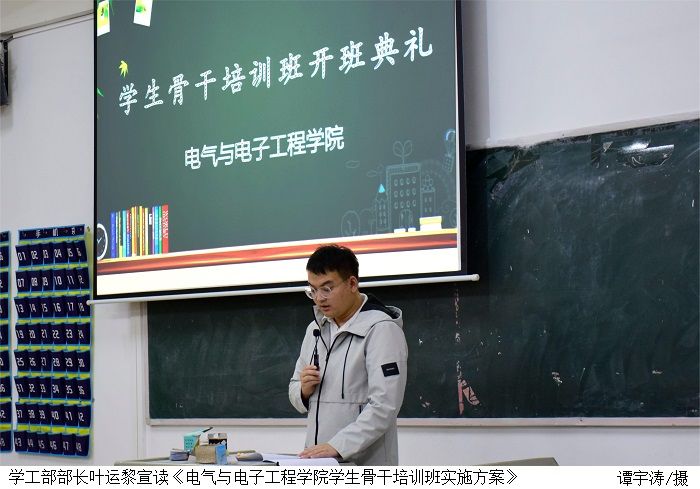 叶运黎宣读了《电气与电子工程学院学生骨干培训班实施方案》,就工作安排、培训内容和培训形式进行了简要介绍,并对培训纪律和成绩考核进行了强调。他要求全体学员在培训过程中要做到思想上高度重视,学风上联系实际,作风上遵守纪律。