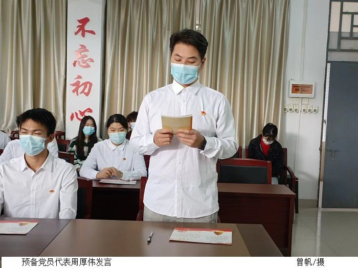 周厚伟代表新发展预备党员发言,他感谢党组织对自己的教育和培养,表示一定会响应党的号召,履行党员义务,做一名合格的党员,为党的事业奋斗终生。