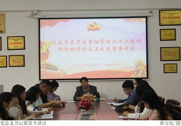 本网讯(信息技术学院 陆翠荣)为深入学习宣传贯彻党的二十大精神的首要政治任务,深刻领会其精神实质和核心要义。2月22日下午,信息技术学院党总支于振华楼203室召开“习近平在学习贯彻党的二十大精神研讨班开班式上重要讲话精神”专题学习会。