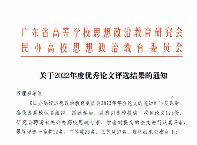 本网讯(马克思主义学院)自去年广东省高等学校思想政治教育研究会民办高校思想政治教育委员会《民办高校思想政治教育委员会2022年年会论文的通知》下发后,马克思主义学院认真组织,踊跃参加。近日论文评选结果出炉,马克思主义学院学术理论研究再创新高,院长李佩琼教授、书记何志红副教授、吴月、庞明明、孔祥志五位老师论文获选优秀论文奖。