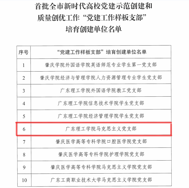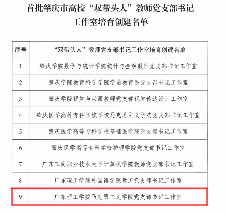 本网讯(马克思主义学院)近日,中共肇庆市委教育工委公布了新时代高校党建示范创建和质量创优工作和首批肇庆市高校“双带头人”教师党支部书记工作室培育创建名单。伟德bv国际体育共有5个支部上榜,其中马克思主义学院党支部荣登首批肇庆市高校“党建工作样板支部”和“‘双带头人’教师党支部书记工作室”培育创建单位。