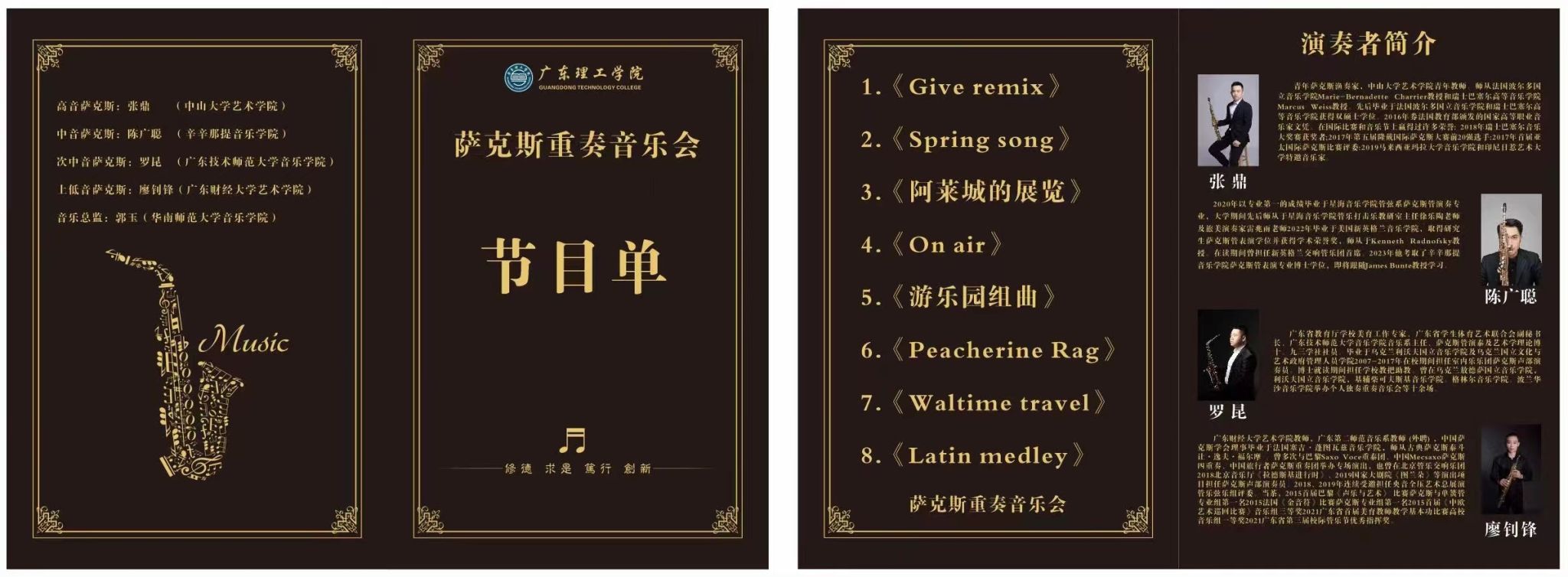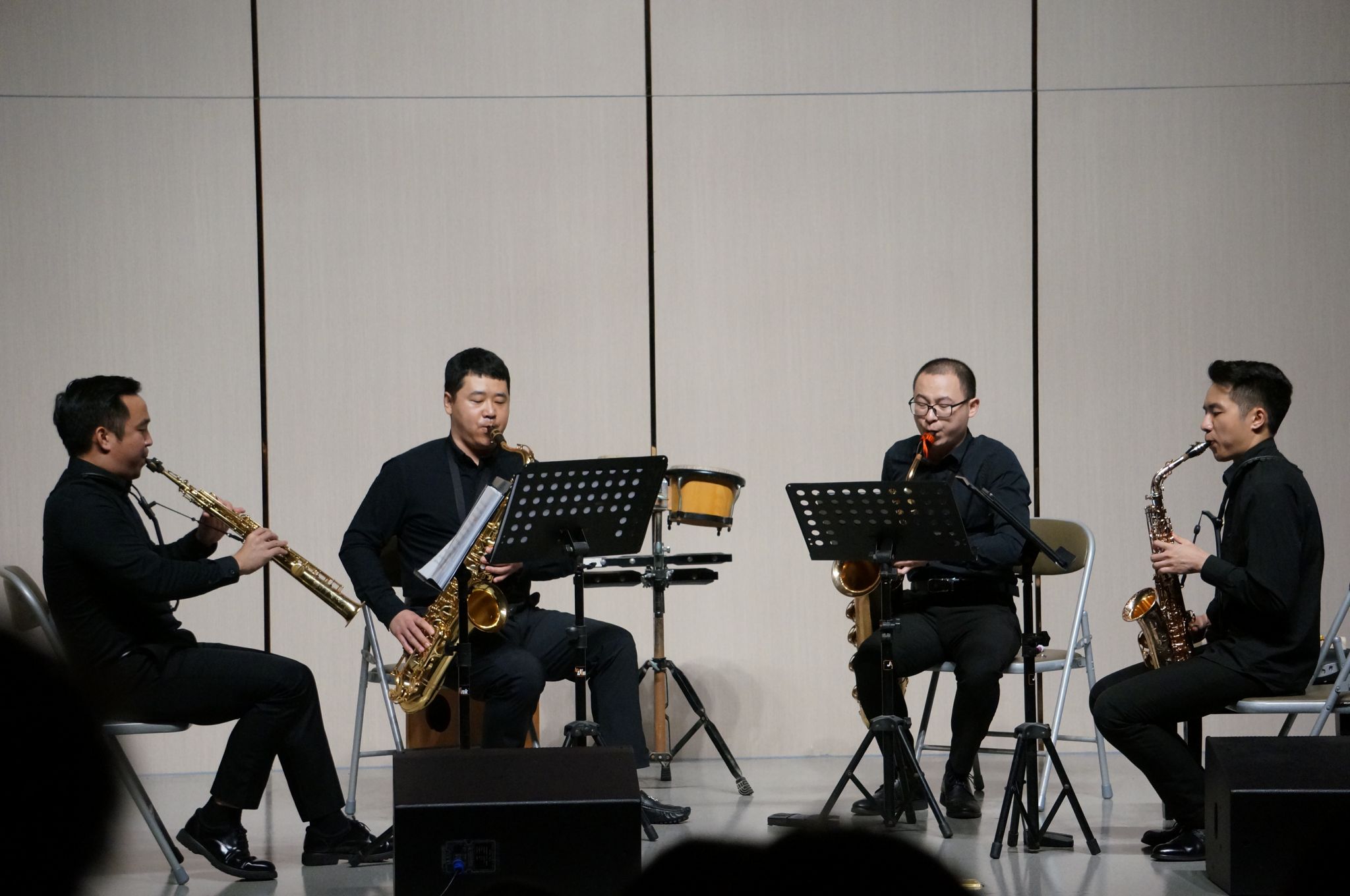 本网讯(通识教育中心 但志慧为落实立德树人根本任务,引领学生树立正确的审美观念,达到以美育人、以美化人、以美培元的目的,通识教育中心结合课程优势、精心策划,于2023年5月19日在高要校区艺术系音乐厅成功举办萨克斯重奏音乐会。此次音乐会特邀高音萨克斯演奏家张鼎先生、中音萨克斯演奏家陈广聪先生、次中音萨克斯演奏家罗昆先生、上低音萨克斯演奏家廖钊锋先生,共同为同学们带来了一场精彩绝伦的音乐盛宴。