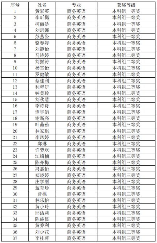 本网讯(外国语学院新闻中心)第八届全国大学生学术英语词汇竞赛于2023年3月1日正式启动报名,经历了三轮比赛的角逐,于5月21日正式落幕。本届大赛共有超16万大学生报名参赛,4月15日开启正式比赛,初赛决出此次比赛的优胜奖及复赛资格;4月22日的复赛,决出了本届比赛的一、二、三等奖。我院学子积极参赛,在吕丽红老师、刘宁老师、何亚女老师、何黎丹老师、葛银凤老师、李林虹老师和刘瑶老师等教师的精心指导下,经过激烈的竞争,最终从众多参赛选手中脱颖而出:其中黄彩英、李昕樾等6人获得本科组一等奖;刘静怡、马诗婷等10人获得本科组二等奖;谭宇娟、谢斯亮等21人获得本科组三等奖。获奖名单如下: