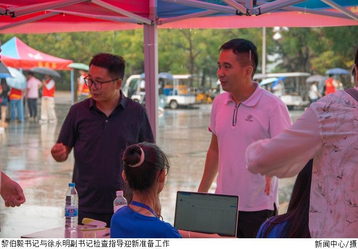 迎新当天,会计学院党总支书记黎伯毅,副书记徐永明,2023级专升本新生班级辅导员深入迎新工作现场,检查指导迎新的各项准备工作,详细了解新生报到进展情况,关心问候迎新一线工作人员,并为他们送去饮料、雪糕等防暑降温物资。同时,黎伯毅对大家的辛勤付出给予了高度肯定和赞扬。他强调,全体工作人员在准确落实接待新生任务的同时,也要做好自身的防暑工作,量力而行。