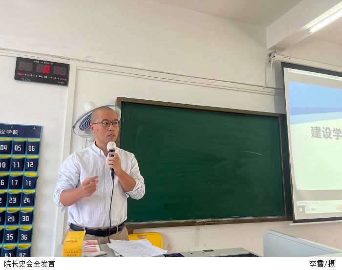 史会全院长做会议总结,他表示学院力争为各位教师打造平和的工作环境,希望教师们扎实做好常规本职工作,积极投身于教改项目和教学竞赛等工作中,在科研工作上能够展示风采,全院上下团结一致打造更好更强的建设学院。