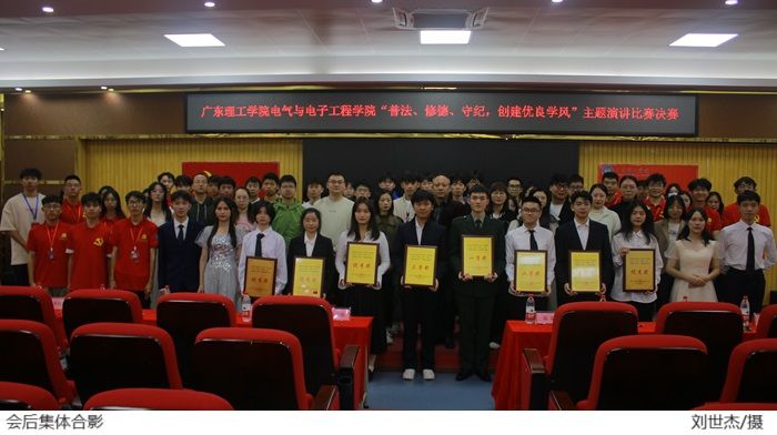 本网讯电气与电子工程学院学生党建工作中心 柯棋哲)为加强法治教育,提高学生法治意识,道德水平和纪律观念,推动在全体学生中形成尊法守法学法用法的良好氛围,电气与电子工程学院11月14日在42栋101报告厅举行“普法、修德、守纪,创建优良学风”演讲比赛决赛,电气与电子工程学院党总支陈文华书记、陈强副书记,全体辅导员出席活动。