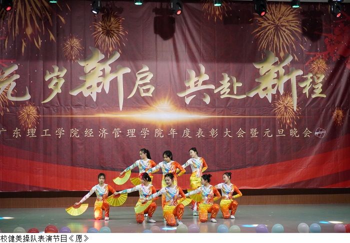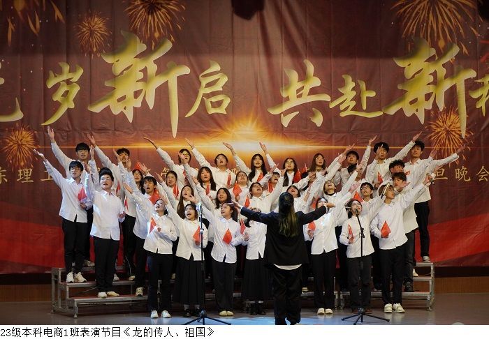 颁奖结束,伴随着各组织代表的走秀,元旦晚会正式开始。助理团《第一天》以及助班团《向幸福出发》都向各学子传达出美好寓意,东门街舞协会带来的《西海岸比奇堡》更是将现场气氛推向顶点。而后的节目,党建中心《青春中国》展示青春之风采,23级本科电子商务1班《龙的传人、祖国》展示青春之责任,团委、学生会《家有儿女》展示团圆之美好。休息途中便是激动人心的抽奖环节。最后,校健美操队《愿》、经济管理学院《以你为镜》和新闻中心《123008宿舍风云》都为观众们带来全新的观赏体验。全体人员合影留念,晚会落下帷幕。