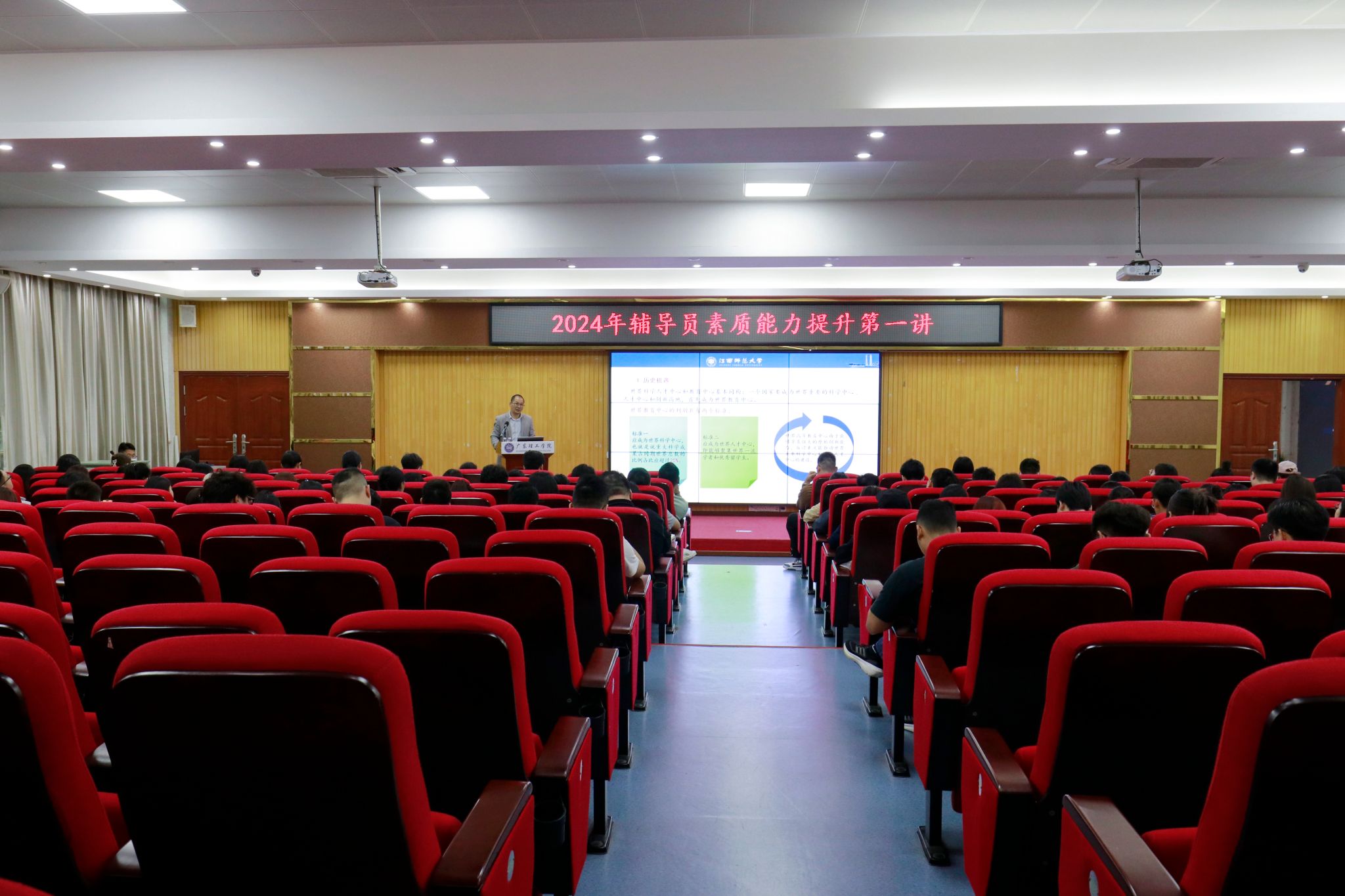 本网讯(学生处)4月8日下午,学生处在高要校区42栋101举办2024年辅导员素质能力提升第一讲、第二讲。此次讲座特邀请江西师范大学教育学院朱家德教授作题为“教育强国建设中的高校教师师德师风与论文写作”的专题讲座,伟德官网全体辅导员参加本次讲座,讲座由学生处副处长钟兆天主持。
