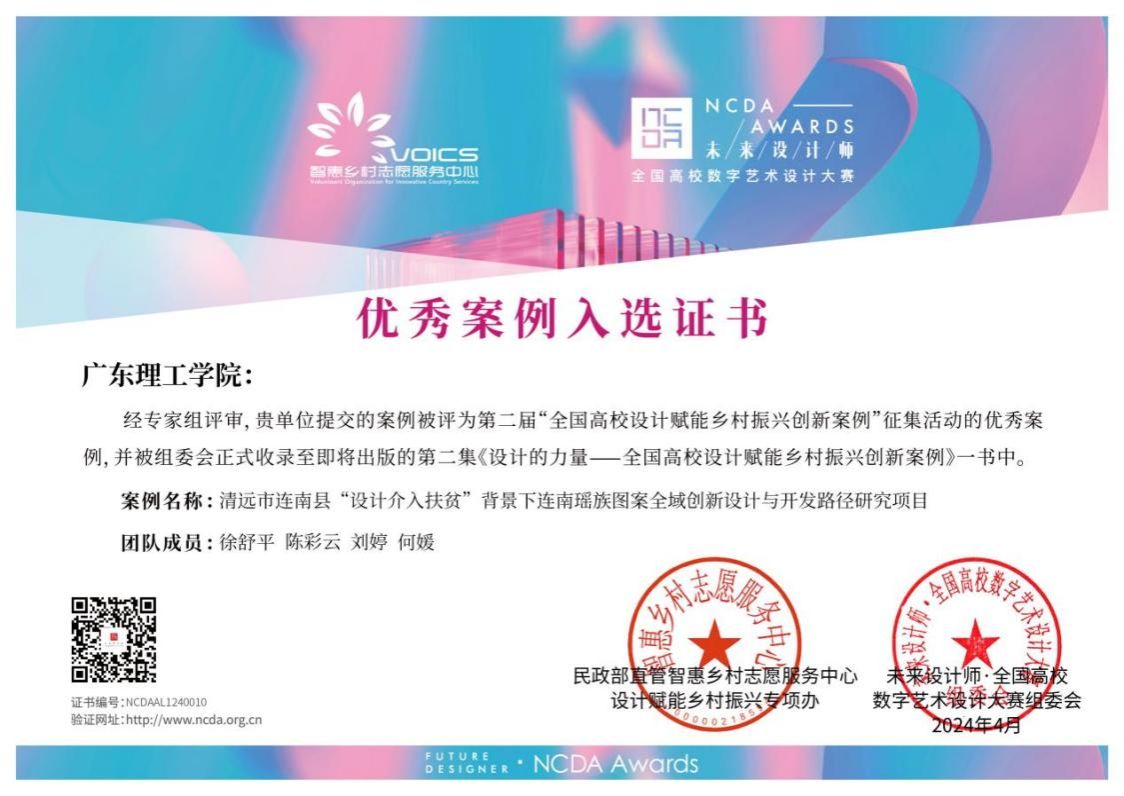由艺术设计学院老师徐舒平、陈彩云、刘婷、何媛组成的团队申报的项目案例《清远市连南县“设计介入扶贫”背景下连南瑶族图案全域创新设计与开发路径研究》突出重围,作为伟德官网唯一案例荣幸入选,入选第二届全国高校设计赋能乡村振兴创新案例征集活动优秀案例,成为乡村振兴创新领域的亮点之一。