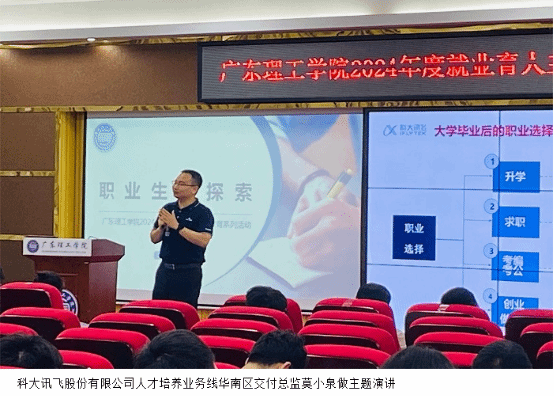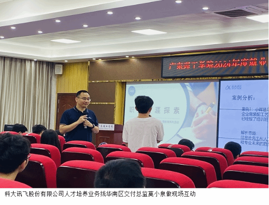 活动现场,科大讯飞股份有限公司人才培养业务线华南区交付总监莫小泉为在场师生就探索学生职业兴趣,帮助学生了解行业、企业、岗位相关情况,引导学生树立职业生涯愿景等方面进行授课。他运用专业的理论知识,结合多年就业教育、实际工作过程中遇到的典型案例,引导大家学会如何进行自我认知探索、如何决策自身职业生涯以及如何补足自身职场能力,积极开展实习、就业准备。