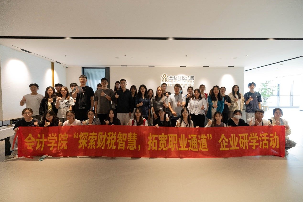 本网讯(会计学院 张雅池)为了拓宽会计学院学生视野,增加学生就业渠道,2024年10月24日下午,会计学院郑春晓副院长,李铸城、平涛和沙旭三位老师带领29名学生代表一行前往佛山金鼎财税集团有限公司开展“探索财税智慧,拓宽职业通道”主题的企业研学活动,实地参观佛山金鼎财税集团有限公司(佛山顺德)。