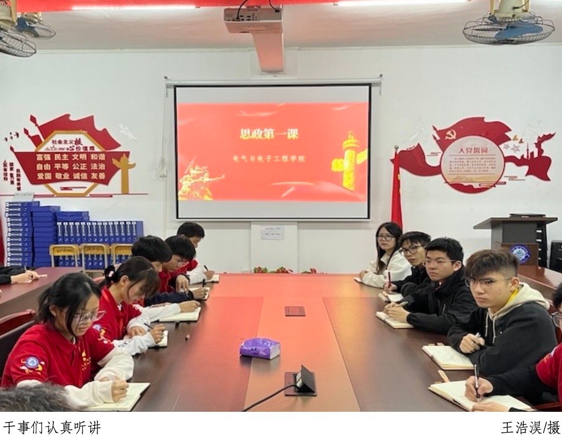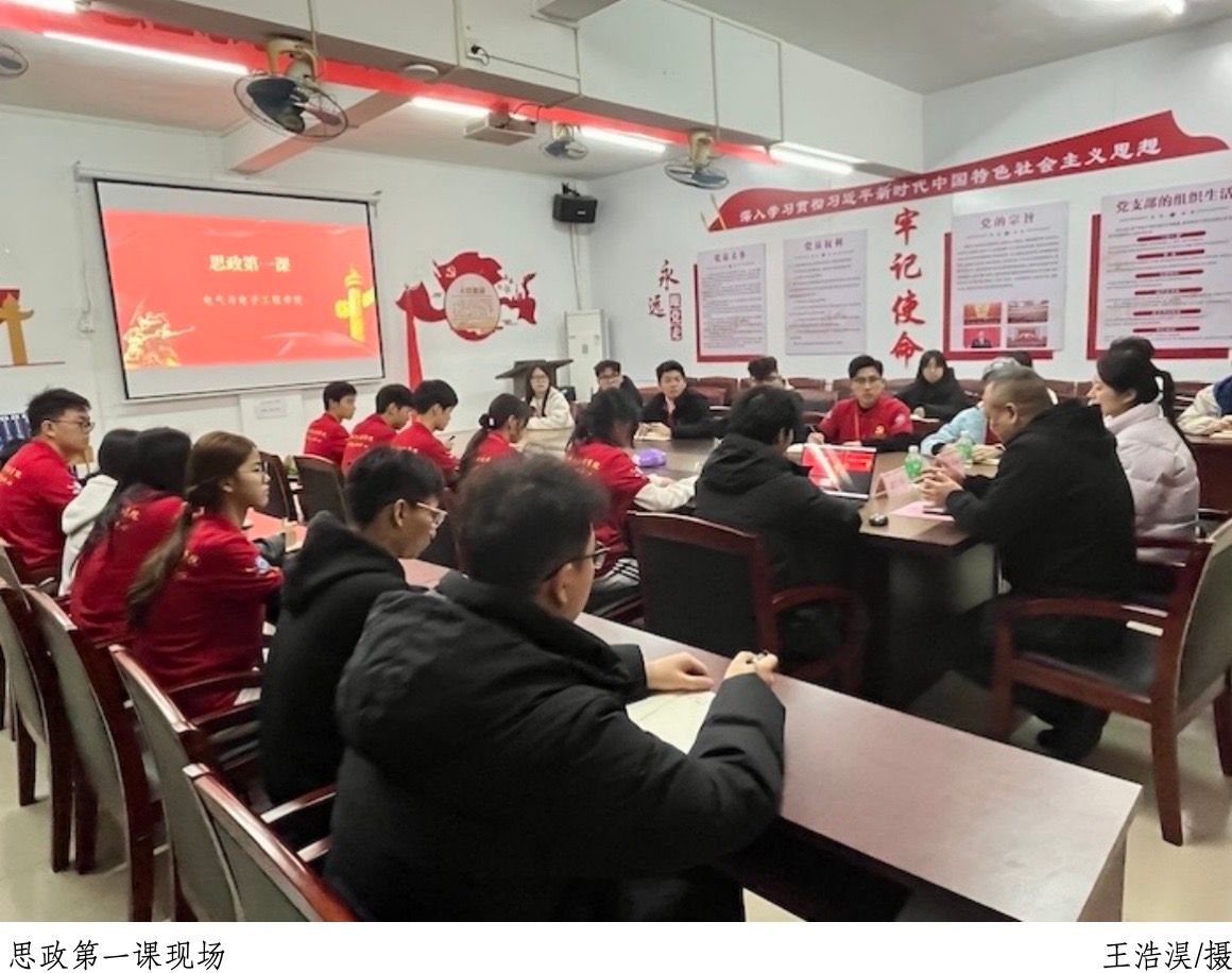 本网讯(电气与电子工程学院学生党建工作中心钟妮珊)3月7日中午,电气与电子工程学院党总支书记陈文华在7栋203室以“厚植家国情怀,担当复兴大任”为主题讲授思政第一课,学生党建工作中心全体干事共同参与。