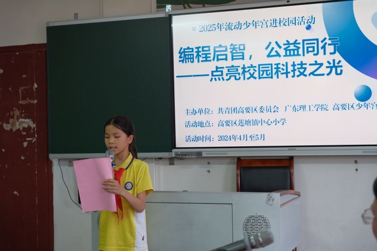 接着,高要区莲塘镇中心小学学生代表蔡沁语同学发言。她表示希望能在编程班找到志同道合的朋友,一起学习,一起挑战难题,为自己的学习、生活打下基础。蔡沁语同学的发言赢得了现场阵阵掌声,也代表了同学们对知识的渴望和对未来的信心。