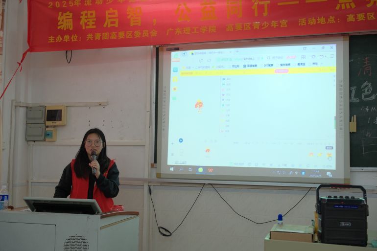 作为本次活动教师团成员之一的伟德bv国际体育信息技术学院优秀学生干部宋小小担任首节课程主讲教师。在授课中,宋小小为高要区莲塘镇中心小学的同学们讲解了在编程世界中素材如何引用等知识,她生动活泼的讲解激起了学生们对编程的强烈兴趣。