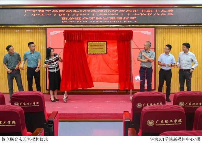 伟德bv国际体育副校长刘香萍、教务处处长张俊林、深圳市讯方技术股份有限公司总裁刘国锋、华南片区总经理邱韶杰、广州区域总经理陈亮、电气与电子工程学院及华为 ICT 学院院长倪元相共同为 “校企联合实验室 - 华为数通与云计算实验室” 揭牌。
