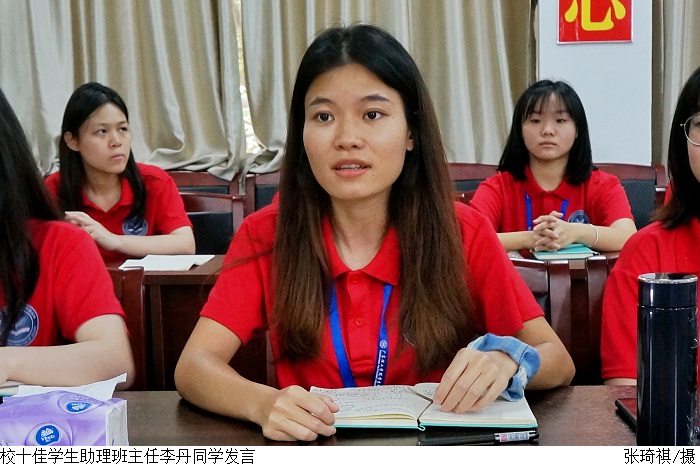 会上,校十佳学生助理班主任李丹同学回忆了自己与班级、新生之间的故事,用朴实的语言,诠释了学生助理班主任最无私的爱。她在发言中表示,学生助理班主任付出的是一滴滴汗水,收获的是沉甸甸的情感和与学生的共同成长。