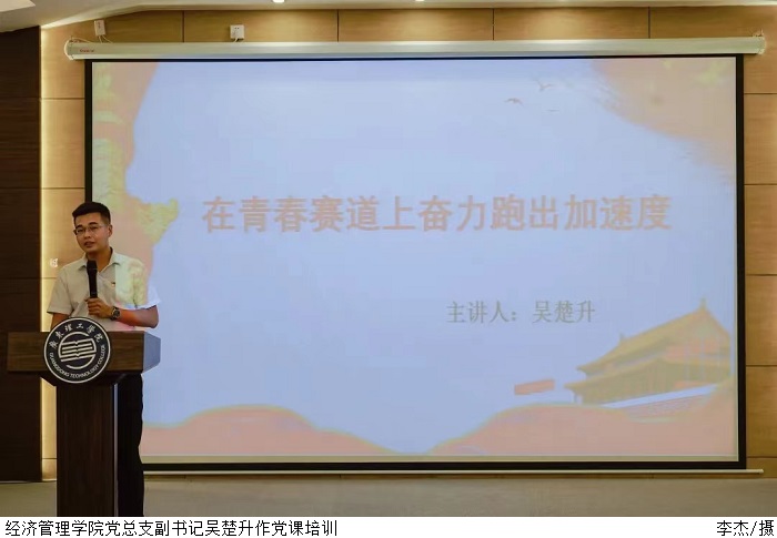 本网讯(经济管理学院 庄慧欣)6月23日晚,经济管理学院党总支副书记吴楚升以“在青春赛道上奋力跑出加速度”为主题在学术报告厅为学生党员讲授专题党课。经济管理学院党建中心指导老师赵雪娇、王娟、各学生党支部书记及全体学生党员参加本次大会。
