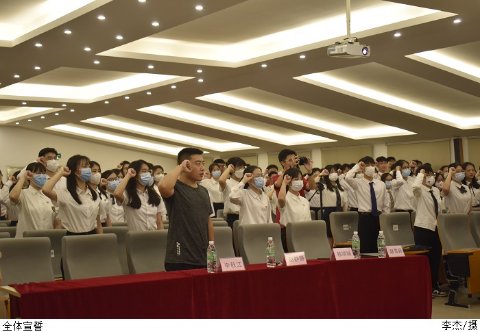在领誓人吴楚升带领下,全体党员一起面对鲜红的党旗,高举右手,重温入党誓词,回顾入党初心,坚定理想信念。