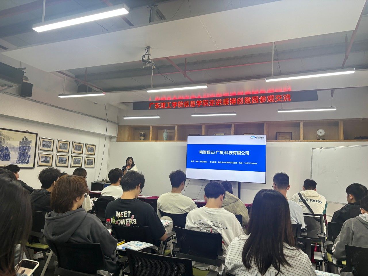 走进精智数云的数字化展厅,有着美的集团IT骨干的企业团队底蕴瞬间拉近了与学子们的距离。其中精智数云副总裁申叶的分享极具价值:“身为学院深度合作企业,团队中汇聚了不少广理校友。正是他们在实战项目中积攒的经验与能力,支撑着团队前进,并成为其核心力量。”
