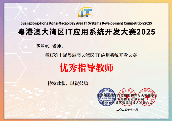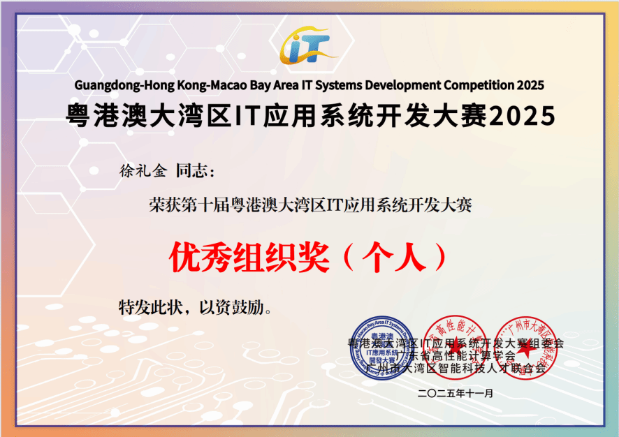 本网讯(信息技术学院)深耕IT创新沃土,勇夺湾区赛事荣光!11月22日,由广州市科协、深圳市科协、香港青年IT网络联合发起,广东省高性能计算学会、广州市大湾区智能科技人才联合会共同主办的“第十届粤港澳大湾区IT应用系统开发大赛总决赛暨颁奖典礼”在广州市南沙区创享湾圆满落幕。作为大赛十周年里程碑赛事,本次活动吸引18个城市近60所高校、11家企业的1500余人报名参赛,提交322个优质项目。伟德官网不仅成功承办肇庆赛区决赛,更在总决赛中大放异彩,伟德官网学子一举斩获特等奖(铜奖)、一等奖、二等奖及多项专项荣誉,伟德官网获评“优秀组织奖”,同时伟德官网多名教师荣获“优秀指导教师奖”,师生团队以硬核实力在大湾区科技竞技舞台上彰显了广理风采。