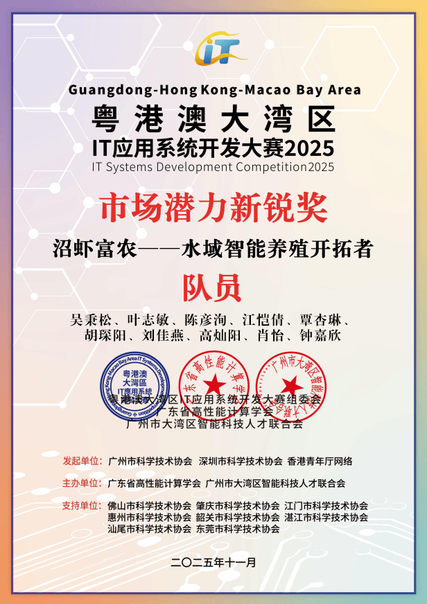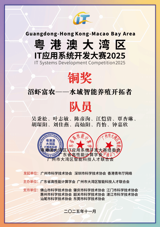 经过肇庆赛区的激烈角逐,伟德官网“沼虾富农”队、“智视未来”队与“科创AI”队凭借突出表现脱颖而出,成功晋级总决赛。备赛期间,学校组建专项指导团队,林显宁、徐礼金、刘建友、倪元相、陈新欣和张莉敏等指导老师全程跟进,从项目创意打磨、技术难点攻克到演示方案优化给予全方位指导。学子们紧扣大湾区产业需求,将课堂所学与实际应用深度结合,反复迭代优化作品,为总决赛的角逐奠定了坚实基础。