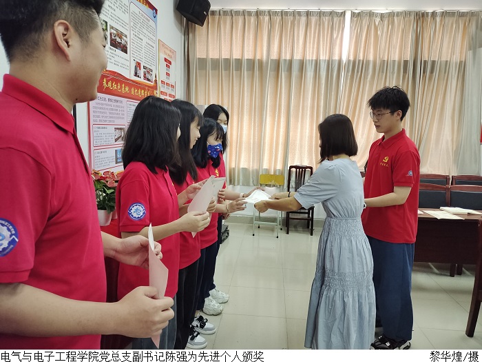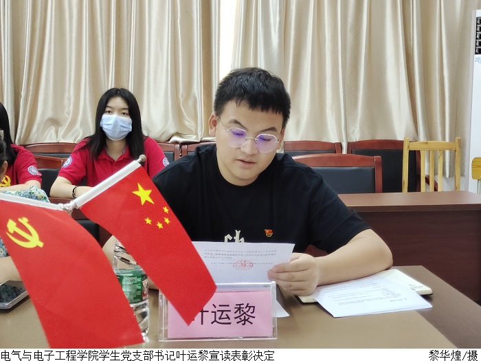 叶运黎宣读《关于表彰电气与电子工程学院学生党支部2021—2022学年先进个人的决定》,他希望受表彰的先进个人要珍惜荣誉,不忘初心、牢记使命、砥砺前进,在今后的工作中取得更大的成绩,希望大家向先进典型学习,继续发挥先锋模范作用,为电气与电子工程学院党建工作做出更大的贡献。