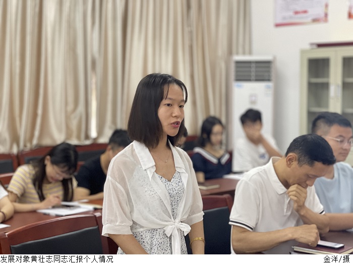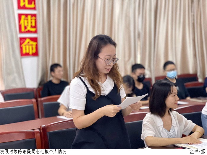 发展对象陈思曼、黄壮志同志分别宣读入党志愿书,汇报对党的认识、入党动机、本人履历以及需要向组织说明的问题;入党介绍人分别向大会介绍发展对象主要情况,并对其能否入党表明态度;与会党员就发展对象是否符合党员条件发表意见。大会认为,陈思曼、黄壮志同志符合中国共产党党员条件,经与会正式党员投票表决,一致同意接收陈思曼、黄壮志同志成为中共预备党员。