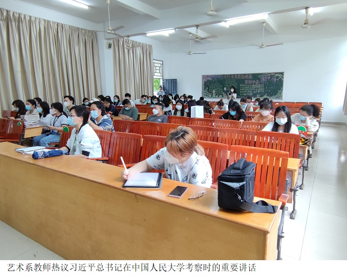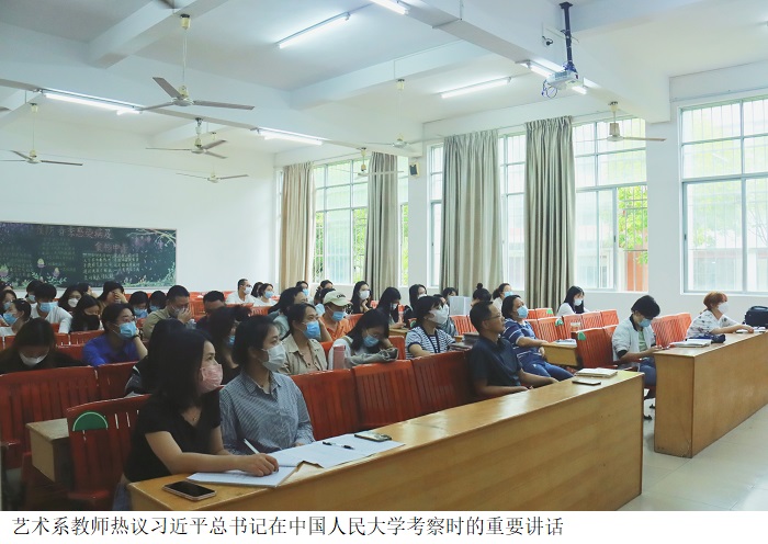 本网讯(艺术系 罗家栋)艺术系于5月10日下午,在6102学习了习近平总书记在中国人民大学考察时的重要讲话精神。党总支书记赵宁领学,艺术系全体老师共同参与。
