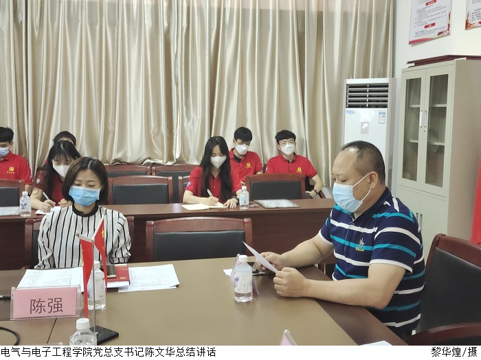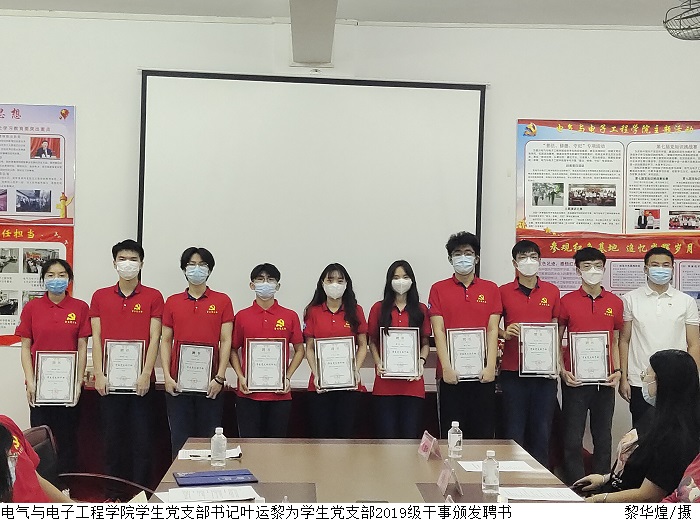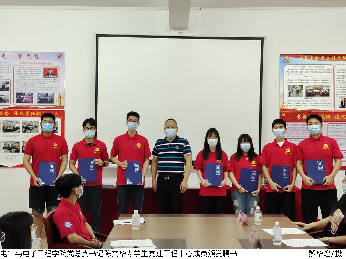 陈强代表党总支宣读《关于成立学生党建工作中心的通知》、《电气与电子工程学院学生党建工作中心部门职责》两个文件。陈文华、陈强、叶运黎分别为第一届学生党建工作中心学生干部、学生党支部2019级干事颁发聘书。
