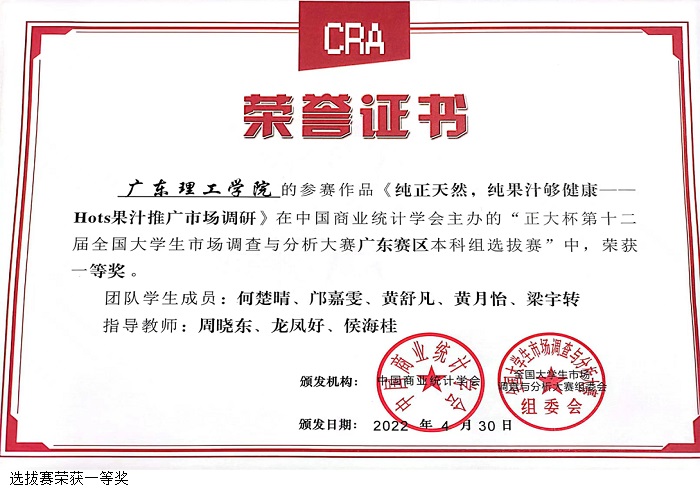 本网讯(会计学院 龙凤好)近日,由教育部高等学校统计学类专业教学指导委员会、中国商业统计学会主办的“正大杯”第十二届全国大学生市场调查与分析大赛广东赛区本科组选拔赛在线上举行。伟德官网学子何楚晴、邝嘉雯、黄舒凡、黄月怡、梁宇转在会计学院周晓东、龙凤好、侯海桂三位老师的带领下积极参赛,最终荣获广东省一等奖。