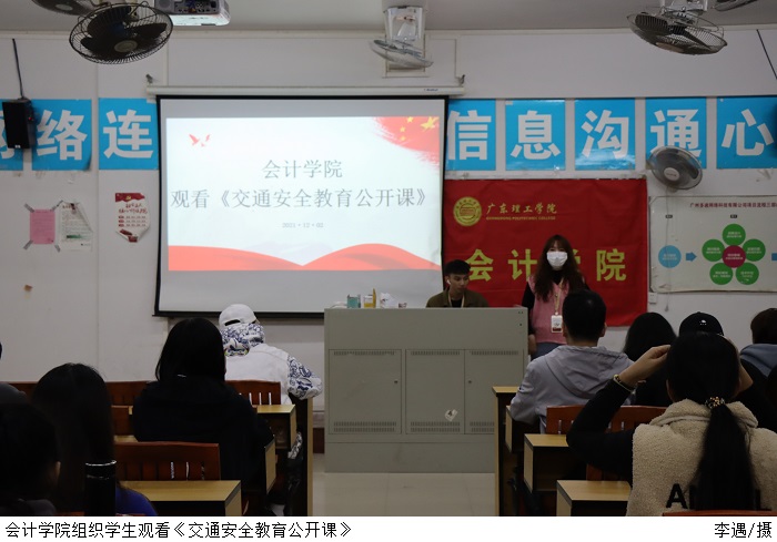 本网讯(会计学院学生党支部先锋队 许灿松)为进一步做好校园交通安全教育,提高学生交通安全的自我防护能力,增强学生的安全意识,在会计学院党总支的部署下,12月2日晚,会计学院在高要校区7211教室组织各班班干部代表收看2021年《交通安全教育公开课》。