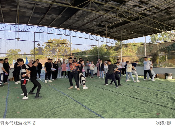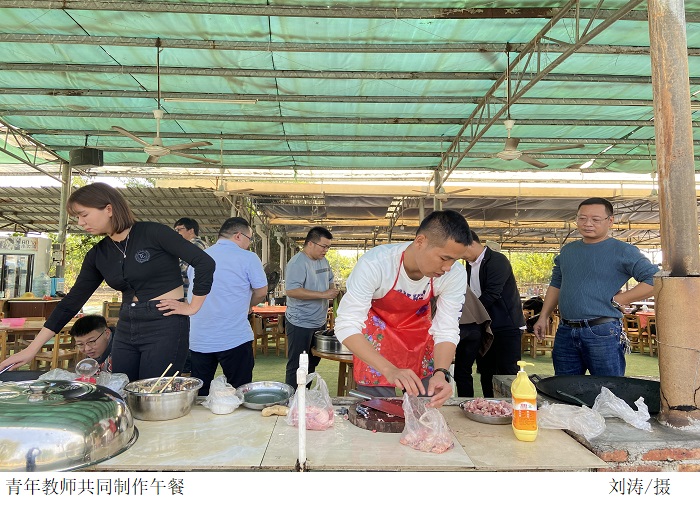 青年教师游览了花海、卡通气模、网红打卡点、萌宠乐园等景点,在自然与生态交织的桃花源体验了独特的田园生活。中午,教师们在拓展基地用提前准备好的食材分组烹煮。大家协调配合,其乐融融,在饭桌上进行了自我介绍和谈心交流环节,促进了彼此间的认识与了解。午饭后,大家分组成队,编写队名和口号、设计队型,开展了“从鸡蛋到人的进化”、“背夹气球”、“同心击鼓”“滴水传情”等各项竞技活动,通过该环节拉近了彼此的距离,在互娱互乐中相互了解,培养默契,增进感情。在紧张刺激的拓展环节后,教师们围坐在篝火前制作烧烤,相互分享一天的收获和感受。