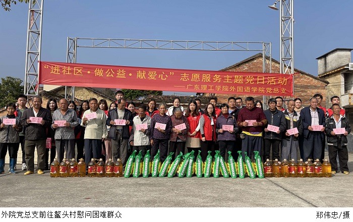 本网讯(外国语学院 肖嘉怡/钟玉君)12月24日,外国语学院党总支深入高要活道镇鳌头村开展慰问及志愿服务活动,党总支书记吕丽红、副书记吕媛、教工及学生党员代表慰问困难群众。