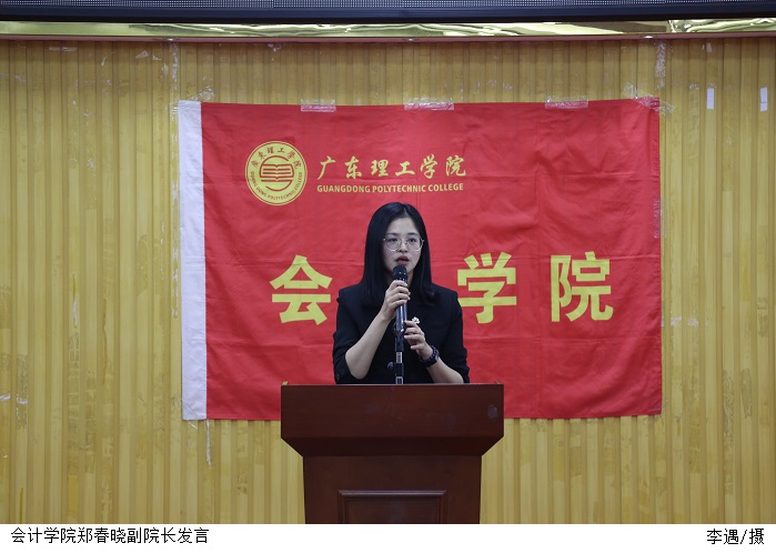 简国明教授致辞,他肯定了会计学院为筹备此次比赛付出的努力,希望同学们能够好好利用这个展示自我的平台,在职业规划中成就未来。