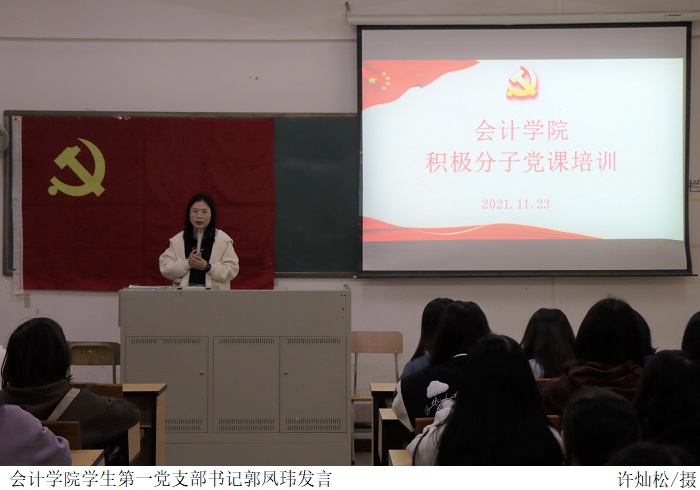 本网讯(会计学院 侯斯瑜)为提高学生思想政治觉悟,端正入党动机,会计学院党总支于11月23日下午在42520教室组织开办入党积极分子党课培训班。会计学院学生第一党支部书记郭凤玮主持培训活动,校党委组织部副科长黎钻仪主讲,会计学院2021年第二批入党积极分子参加。